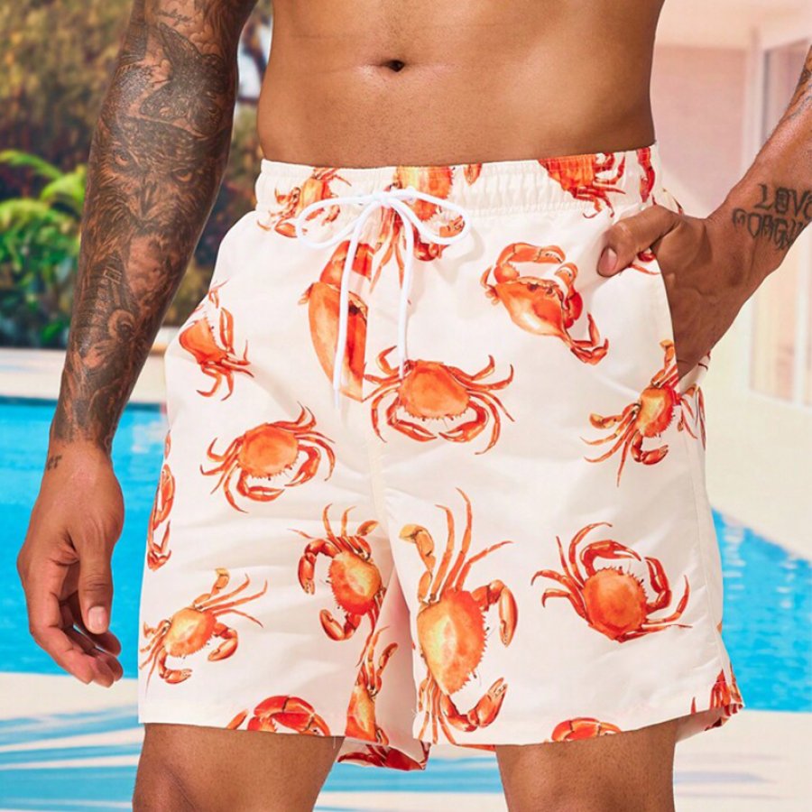 Men Crab Print Drawstring Waist Swim Trunks