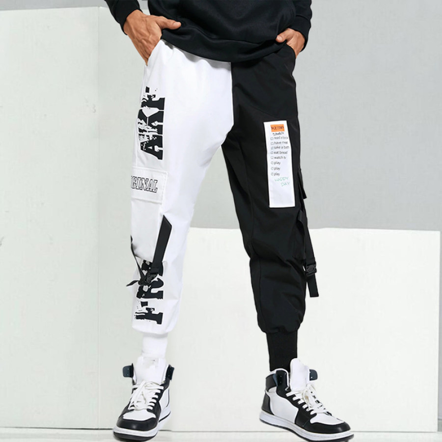 cargo pants,men hip hop style colorblock letter printed drawstring waist cargo pants