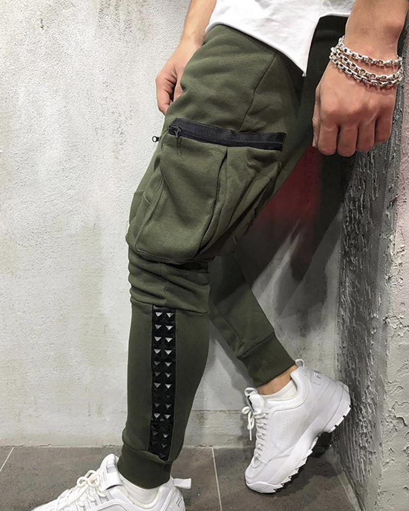 Men Rivet Drawstring Pocket Design Cargo Pants, Army green