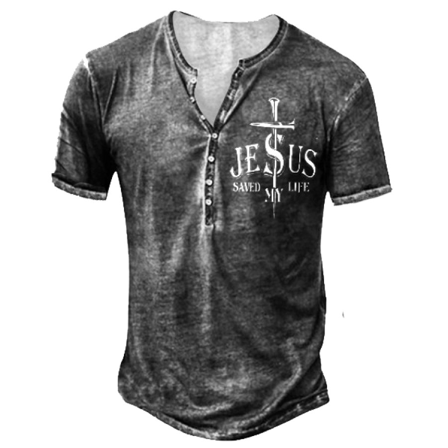 Mens Jesus Cross Button-up Casual Retro Henley Short Shirts
