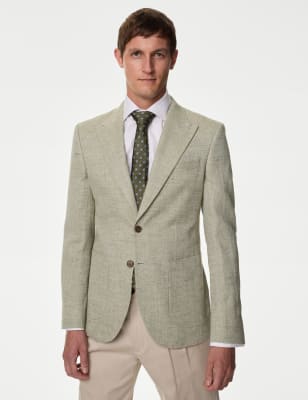 This sleek tailored blazer is made from lightweight Italian linen-blend fabric for supreme breathability. It's fully lined for comfort and has twin vents for easy movement. The single breasted design has a subtle textured weave and features two practical patch pockets and a breast pocket for storing small personal items. The on-trend peak lapels with a buttonhole add a stylish touch. nM&S Collection: easy-to-wear wardrobe staples that combine classic and contemporary styles. Our suits come in a suit carrier to keep it looking fresh while on the move.