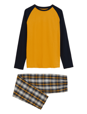 Stay snug on cooler nights in these pure cotton pyjamas. Regular fit. The top has colour block raglan sleeves and the bottoms are checked with a drawstring waist, mock fly fastening and handy side pockets. We only ever use responsibly sourced cotton for our clothes.n M&S Collection: easy-to-wear wardrobe staples that combine classic and contemporary styles.