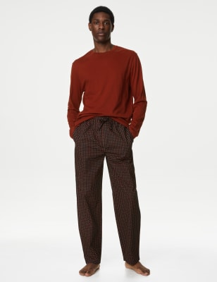 These pyjamas are crafted from pure cotton for an irresistibly cosy feel as you snooze. They're cut in a regular fit, with a drawstring fastening at the waist for comfort. The long bottoms also feature a geometric print for a fun pop, along with slip pockets and a mock fly. Plain top has long sleeves and a crew neck for easy wear. M&S Collection: easy-to-wear wardrobe staples that combine classic and contemporary styles.
