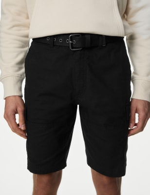 Mens M&S Collection Pure Cotton Ripstop Textured Belted Cargo Shorts - Black, Black