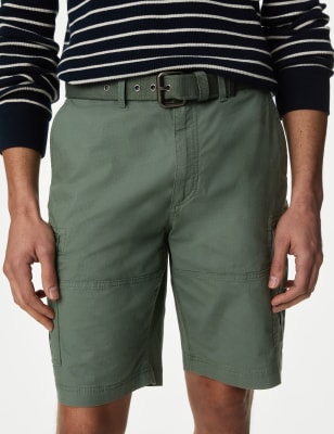 Mens M&S Collection Pure Cotton Ripstop Textured Belted Cargo Shorts - Green, Green