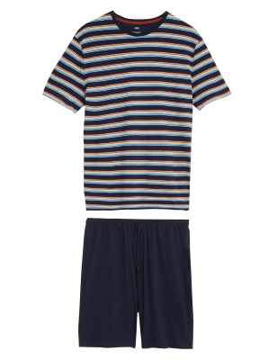 Get set for warmer nights with these pure cotton pyjamas. Comfy regular fit. The short-sleeved top has a multi-striped design. The shorts have handy pockets and an elasticated waist with a drawstring to help you find the perfect fit. We only ever use responsibly sourced cotton for our clothes.n M&S Collection: easy-to-wear wardrobe staples that combine classic and contemporary styles.