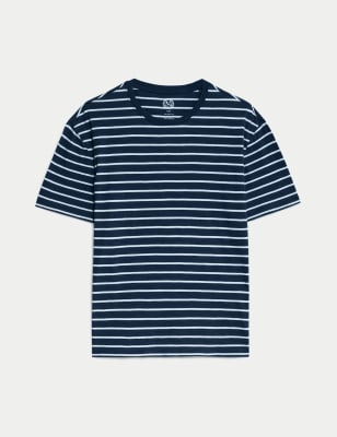 With its classic horizontal striped pattern, this crew neck t-shirt will make a versatile addition to your casual wardrobe. Made to a roomy relaxed fit from soft and breathable pure cotton that's indigo-washed for an authentic look. Stretchy ribbed trims ensure extra comfort.n M&S Collection: easy-to-wear wardrobe staples that combine classic and contemporary styles.