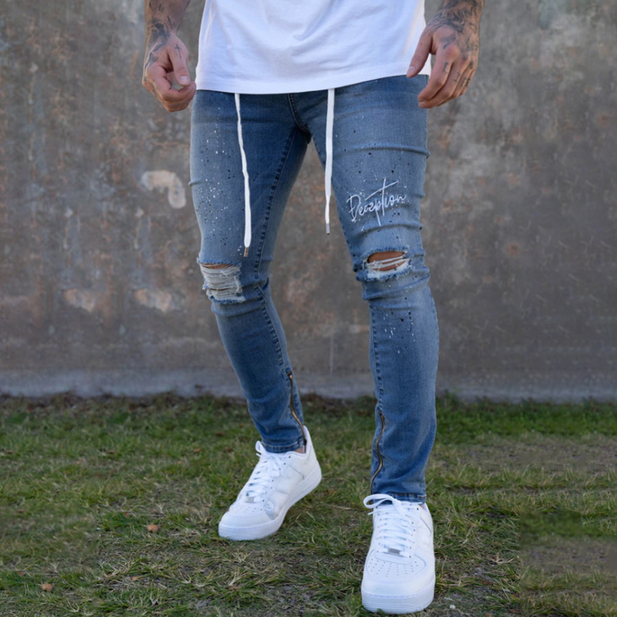 Mens Slim Fit Ripped Feet Paint Tether Jeans