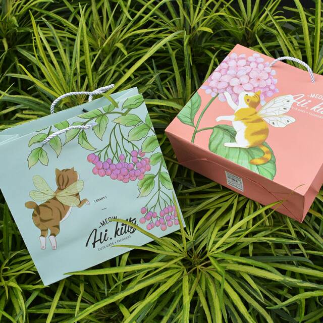 kantong kertas (paper bag) dengan gambar kucing yang sangat menyukai bunga, dan memiliki warna-warna yang cerah. Gunakan untuk memberikan bingkisan / kado atau sekedar pengganti kantong biasa. Kantong berikut talinya terbuat dari kertas tebal sehingga tidak mudah koyak.