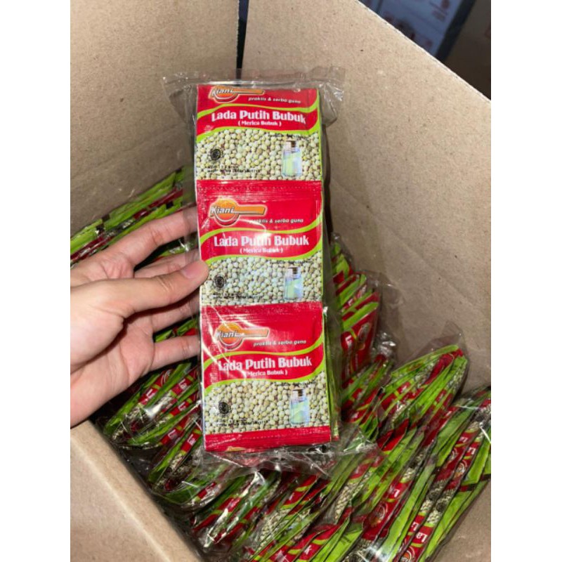 Lada putih bubuk kiani terbuat dari 100 % biji lada putih berkualitas Tanpa penambahan pewarna , pengawet dan bahan campuran lainnya . Lada putih bubuk KIANI memiliki aroma dan citarasa yang membuat setiap masakan menjadi lezat dan nikmat . dengan kemasan praktis 2 gr yang sangat pas untuk masakan sehari hari di dapur anda .