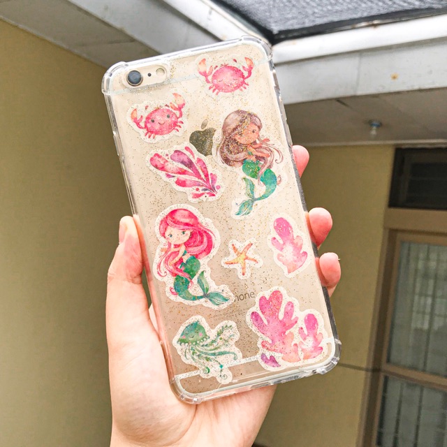 Case dengan stiker mermaid dan resin glitter. Handmade with love and high quality product.