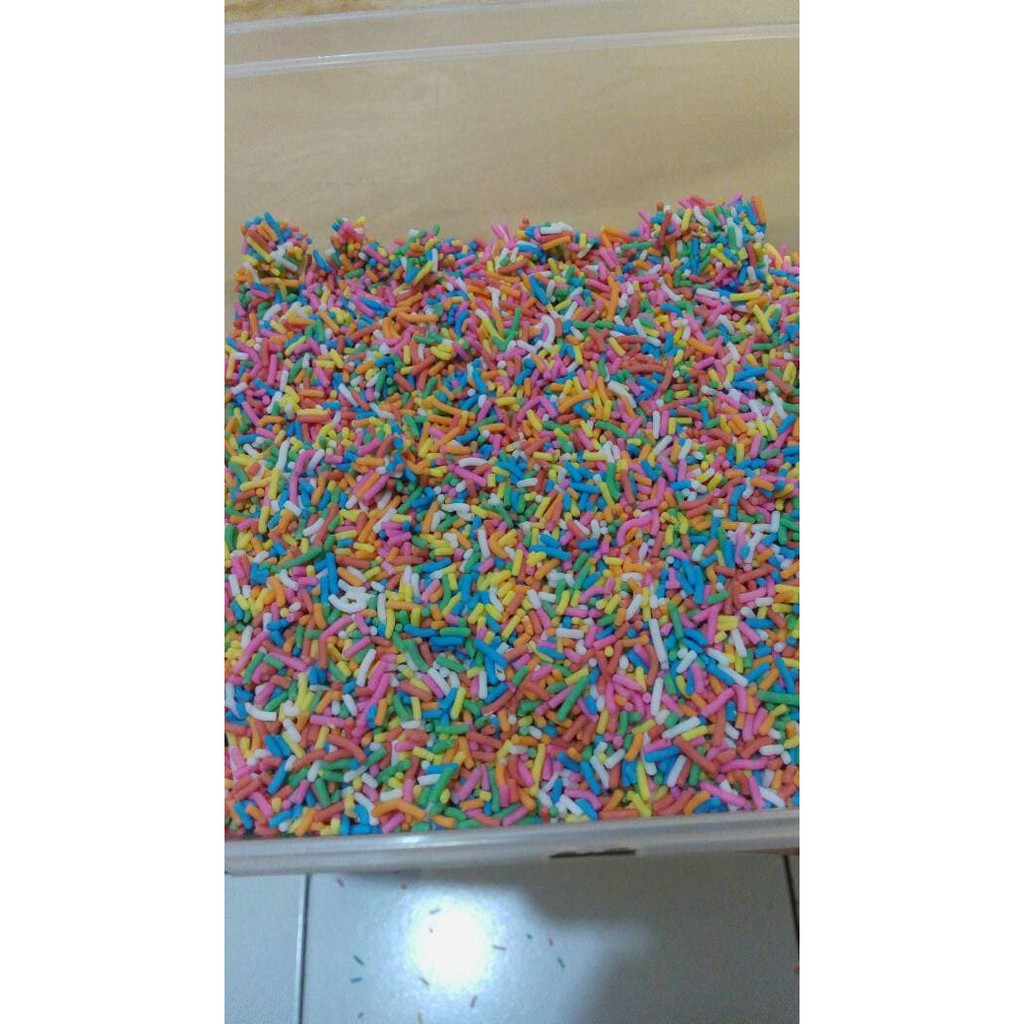 Coklat Meses Rainbow berkualitas dengan rasa coklat premium,warna lebih natural dan dijadikan variasi untuk topping donat dan kue lainnya.