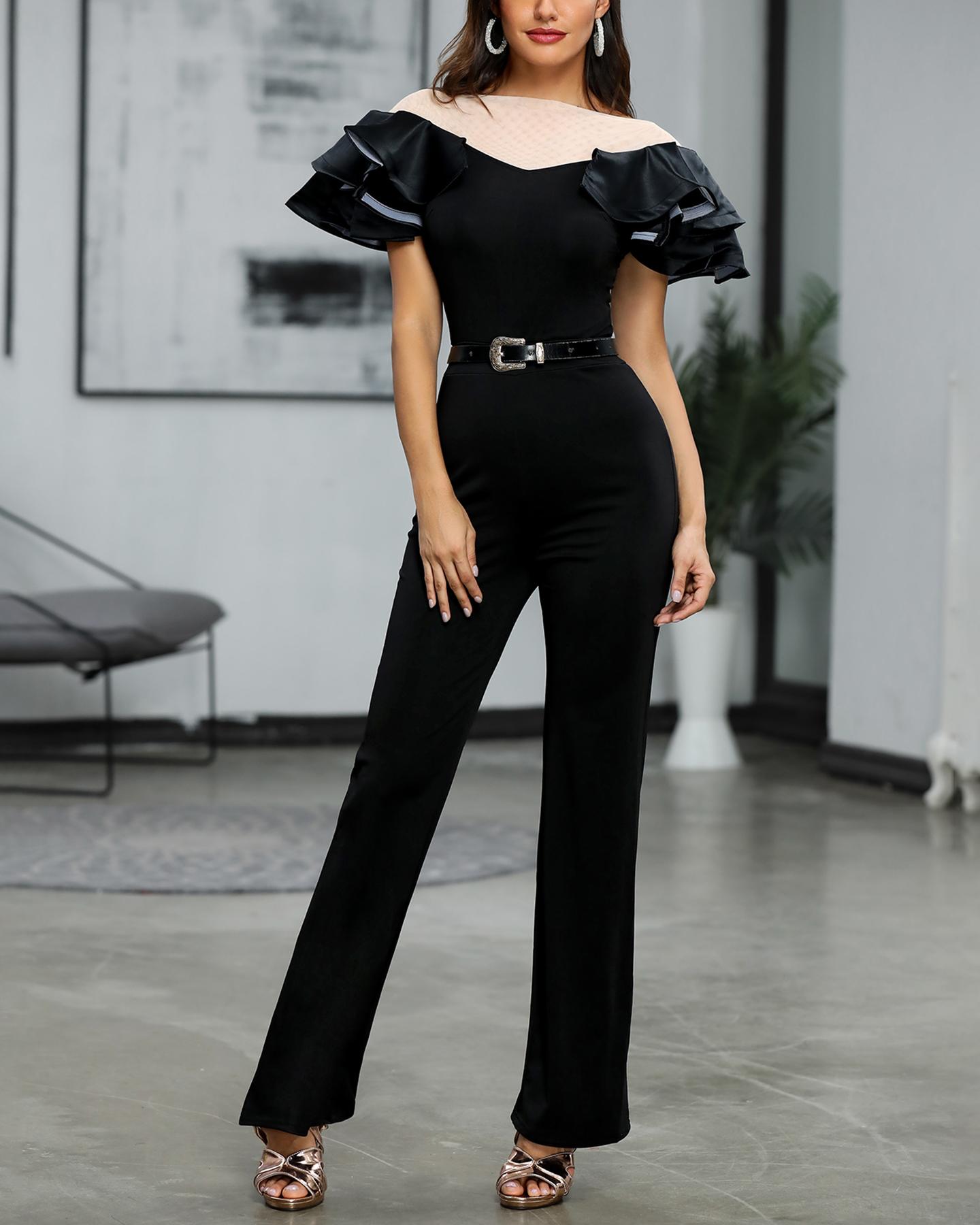 Mesh Insert Ruffles Design Jumpsuit, Black