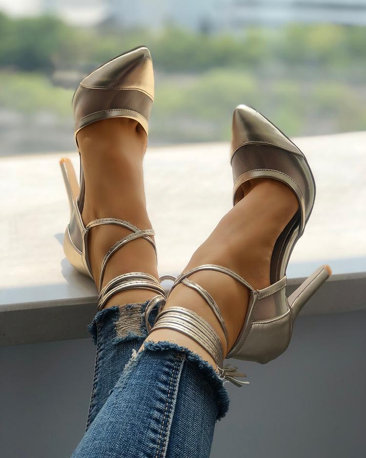 Mesh Patchwork Strappy Thin Heeled Sandals, Gold