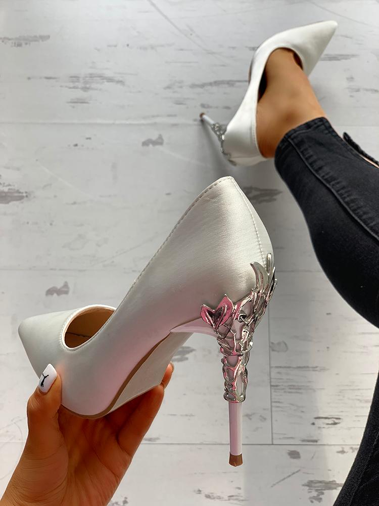 Metallic Embellished Pointed Toe Heels, White