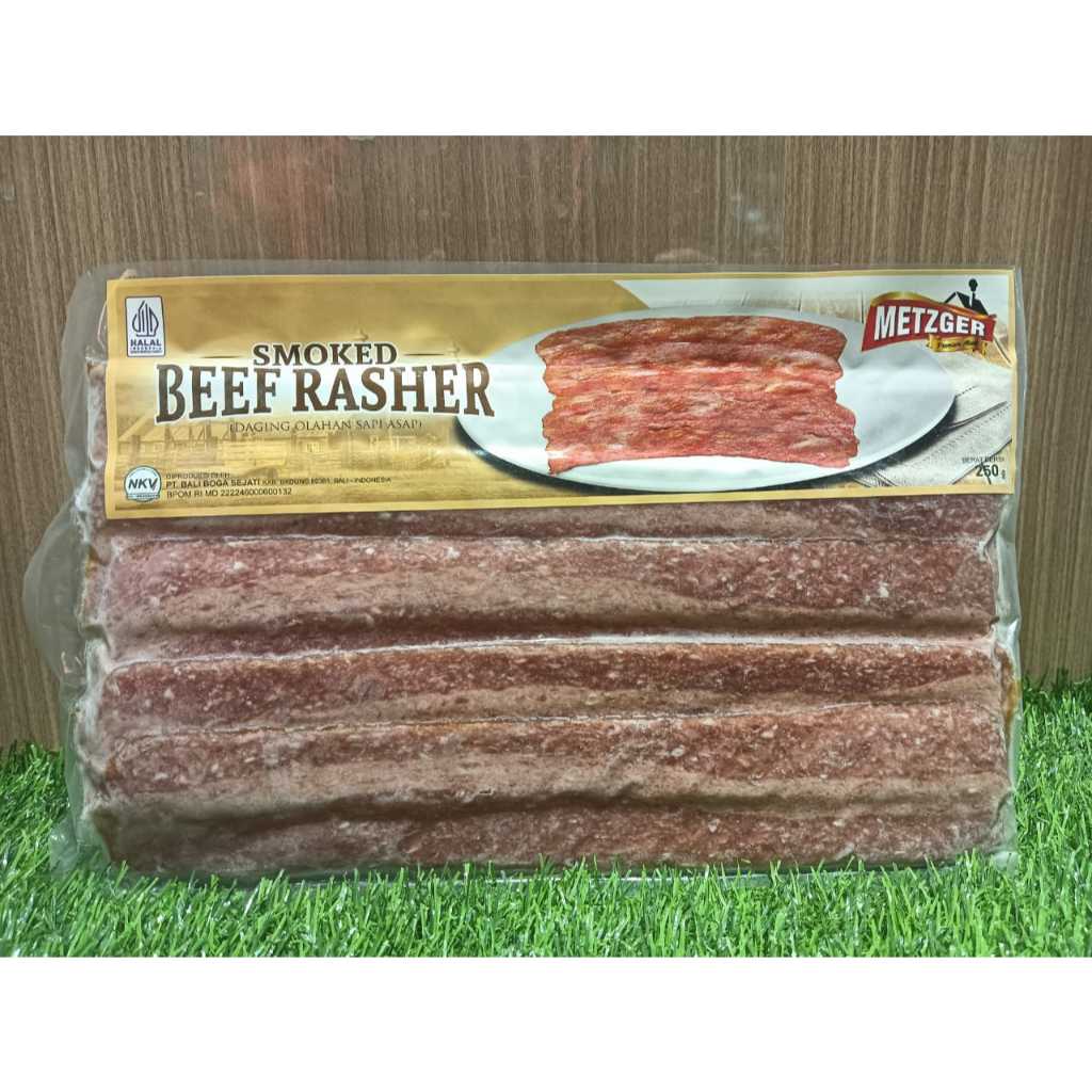 Smoked Beef Rasher merupakan daging sapi sliced tipis yang diproduksi secara halal oleh PT. Bali Boga Sejati (METZGER) yang terbuat dari daging sapi dan bahan-bahan serta bumbu pilihan sehingga menghasilkan citarasa yang nikmat. Proses produksi dengan pengasapan juga menambah citarasa produk ini. Produk ini cocok digunakan untuk Breakfast, A La Carte, Sandwich & Panini serta penyajian dengan Sandwich, Panini dan Spaghetti Carbonara akan menambahkan kenikmatannya saat dikonsumsi.