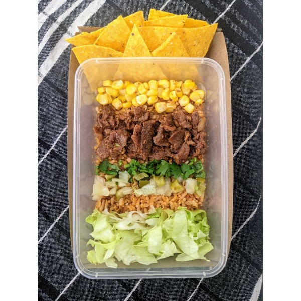 Mexican Seasoned Rice + Beef/Chicken + Nachos Chips + Corn + Chili Onion Pickle + Lettuce + Coriander