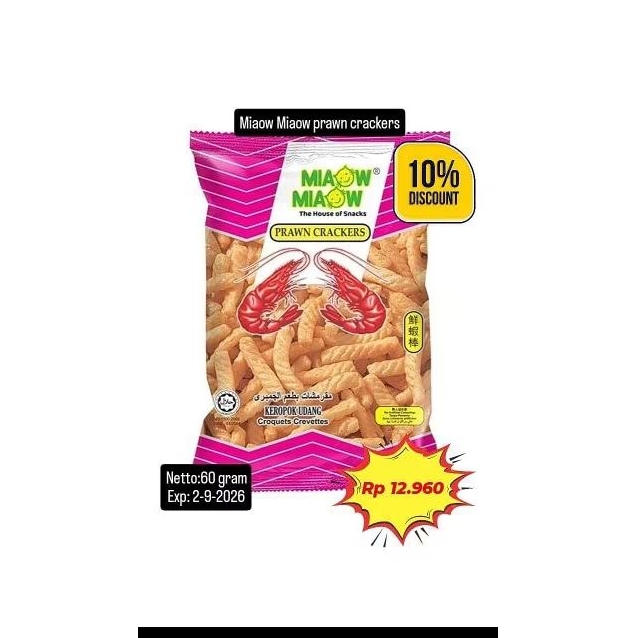 Miaow Miaow Udang adalah kerupuk udang yang renyah dan gurih, dengan cita rasa udang yang autentik. Kerupuk ini cocok sebagai camilan saat santai atau berkumpul bersama keluarga dan teman-teman.