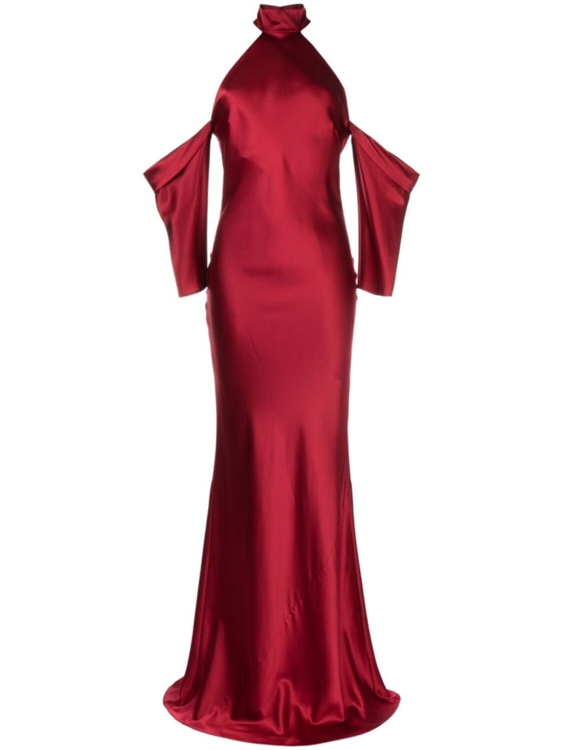 Подробнее о товаре: • красный • шелк • шармюз • рукава с открытыми плечами • вырез халтер • застежка на пуговицы сзади • открытая пятка • длина макси • цельная подкладка