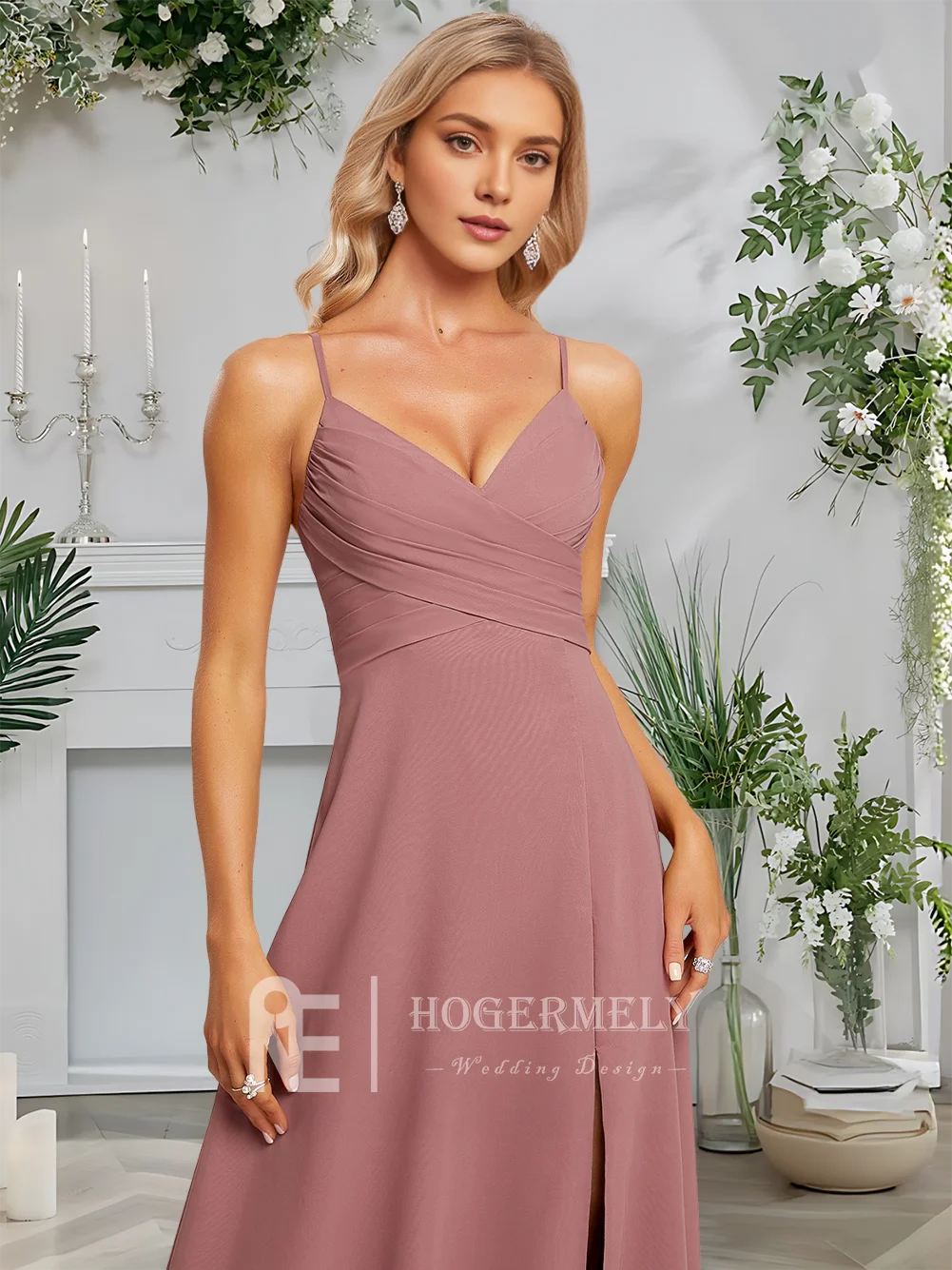 A Elegant Desert Rose A-Line V-Neck Bridesmaid Dresses Floor-Length Chiffon Crossed Straps For Wedding Party Guest Dress