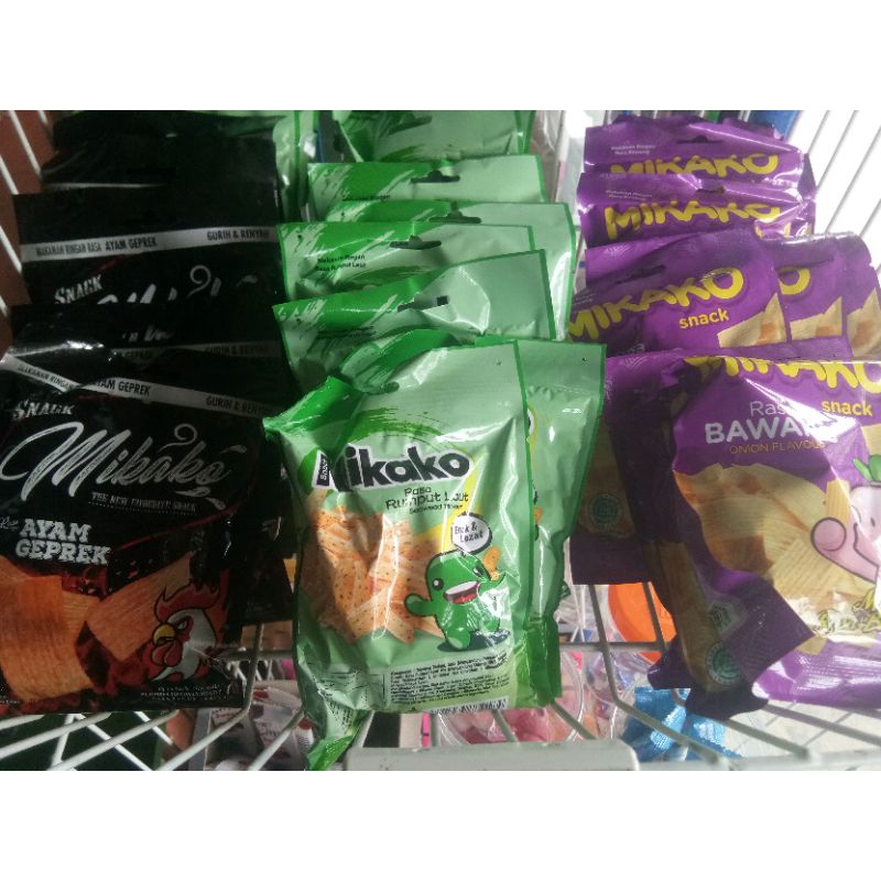 Mikako snack tersedia rasan ayam geprek, rumput laut, bawang dan ada varian mie goreng