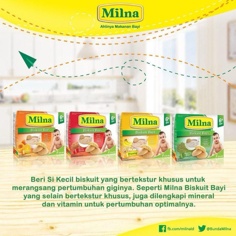 Milna Biskuit Bayi merupakan biskuit kaya gizi untuk usia 6-12 bulan sebagai makanan pendamping ASI pertama dengan tekstur lembut sehingga tidak mudah tersedak dan dapat menstimulasi pertumbuhan gigi Si Kecil agar tumbuh kembang lebih optimal.