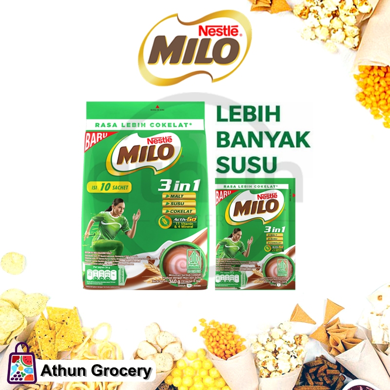 MILO 3in1 Activ-Go adalah minuman serbuk cokelat yang menggabungkan ekstrak malt (Barli) dan susu, dirancang khusus untuk mendukung kebutuhan nutrisi anak-anak yang aktif. Dengan peningkatan zat besi, Vitamin B12, C, dan D, produk ini membantu mencegah defisiensi zat besi serta mendukung performa anak dalam beraktivitas. Dibandingkan dengan produk MILO sebelumnya, MILO 3in1 memiliki 33% lebih rendah gula tambahan per sajian, menjadikannya lebih sesuai dengan anjuran gula untuk anak-anak. Meskipun mengandung lebih sedikit gula, MILO 3in1 tetap mempertahankan rasa khas MILO yang disukai anak berkat kandungan malt dan cocoa yang lebih tinggi. Kandungan malt yang tinggi memberikan karbohidrat kompleks yang mendukung energi anak sepanjang hari. Dengan MILO 3in1 Active-Go, anda dapat memberikan nutrisi yang lengkap dan energi yang dibutuhkan bagi anak-anak anda.