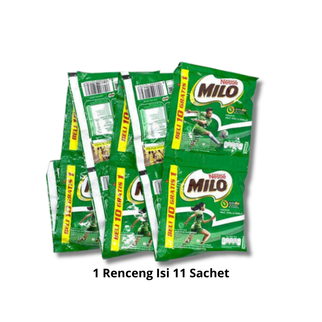 Milo sachet 1 renceng berisi 10–11 sachet, dengan berat 22–35 gram per sachet
