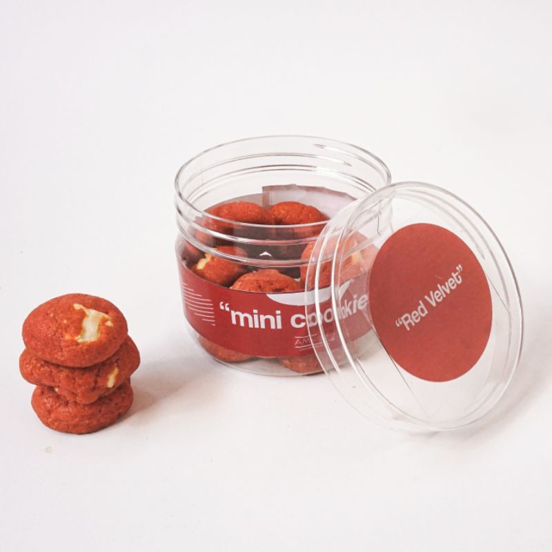 Cookies dengan ukuran mini rasa Red Velvet dengan berat bersih minimal 137gr, panduan rasa Red Velvet dengan tambahan coklat putih yang makin membuat cookies ini Manis dan Gurih