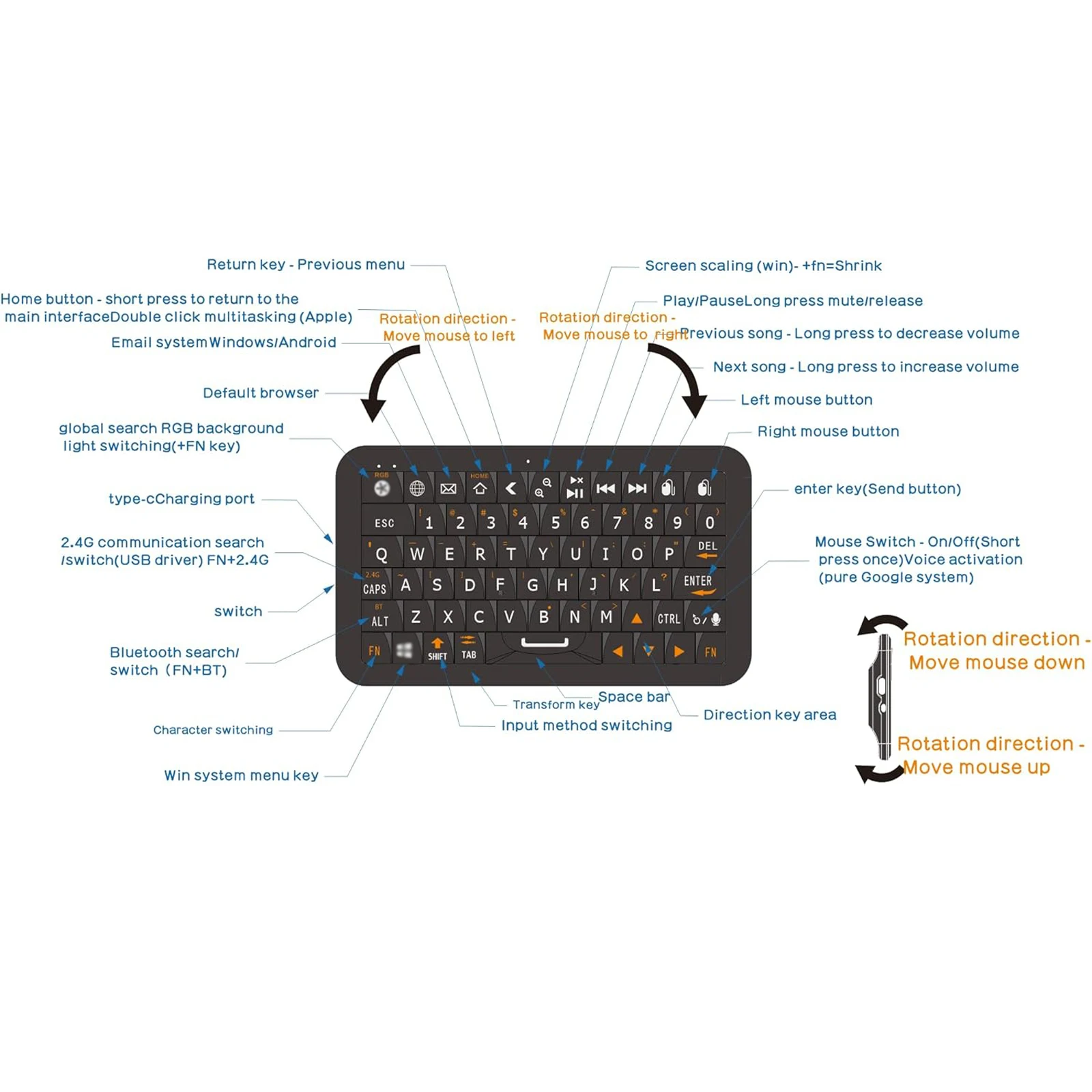 Mini Keyboard with bt 5.0/2.4G Dual Mode, Gyroscopic Motion Mouse, Rechargeable Battery, for Win/for iOS/for Android