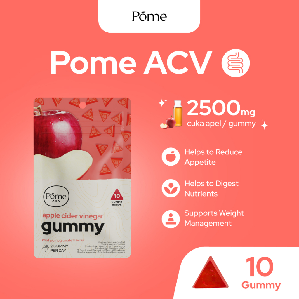 Pome ACV adalah Functional Food Gummy dengan manfaat kesehatan dari konsumsi Apple Cider Vinegar (ACV) dan merupakan Apple Cider Vinegar gummy pertama di Indonesia. Per butir gummy dari Pome ACV mengandung 2500mg Apple Cider Vinegar - kandungan ACV tertinggi di dunia untuk gummy!