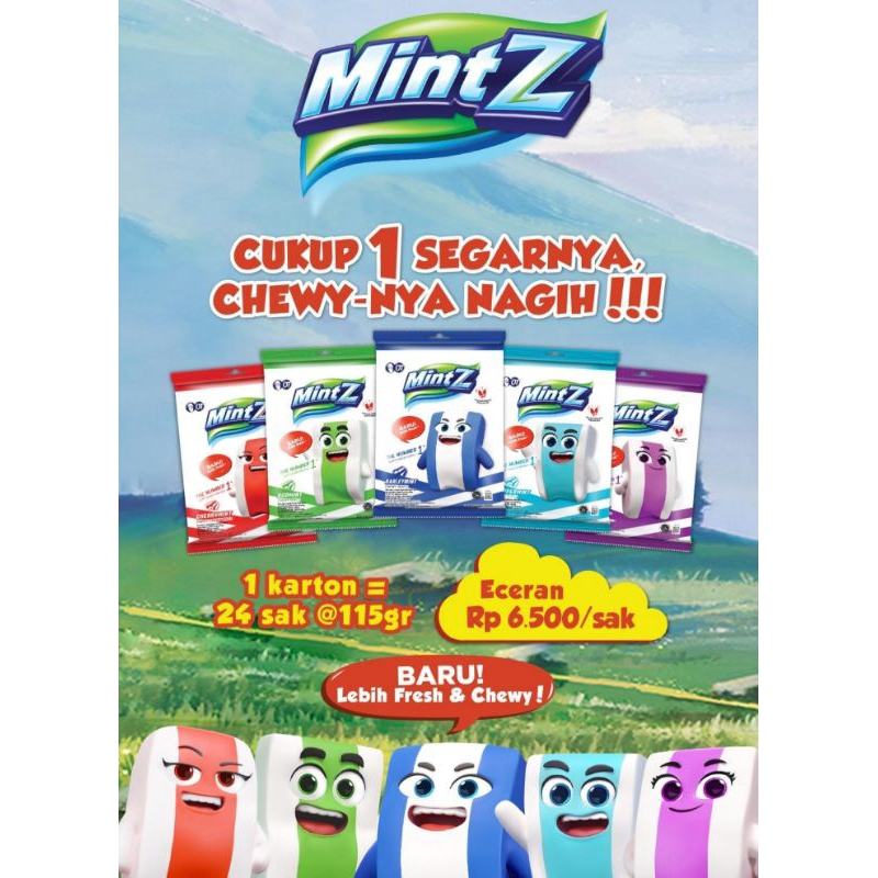 Mintz memiliki berat ±110 gram/sak dengan isi ±50pcs yang terdiri dari 5 rasa, antara lain: cherrymint, duomint, barleymint, peppermint, grapemint.