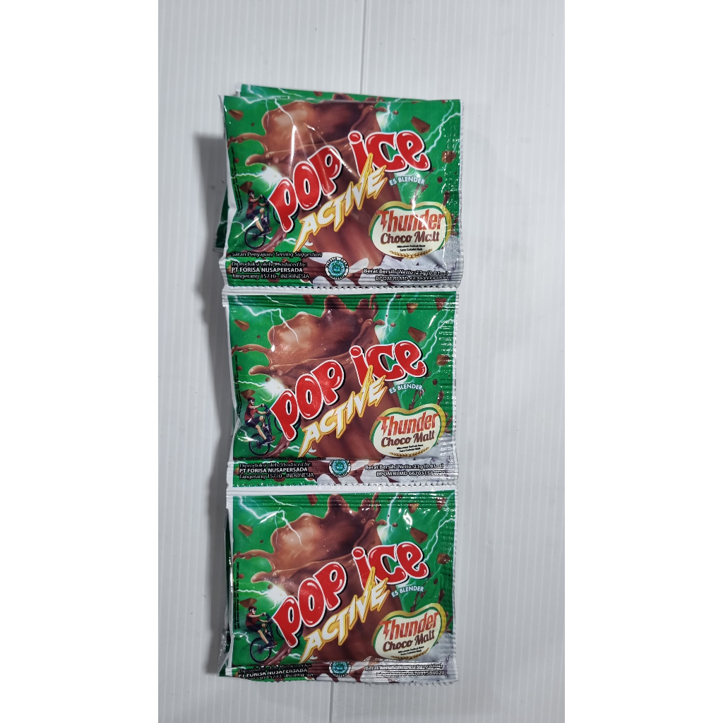 Minuman Bubuk Pop Ice Active Aneka Rasa Renceng isi 10, tersedia rasa thunder choco malt dan tornado squash. Expired 2026.