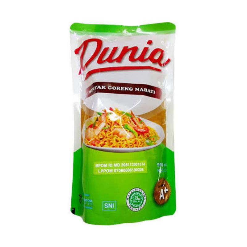 Minyak goreng merk Dunia. Tipe pouch. Berat 900 ml.