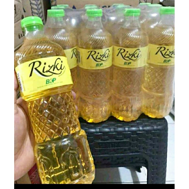 Minyak Goreng premium merk RIZKI kemasan botol 900 ml dari BKP. jernih dan bening.
