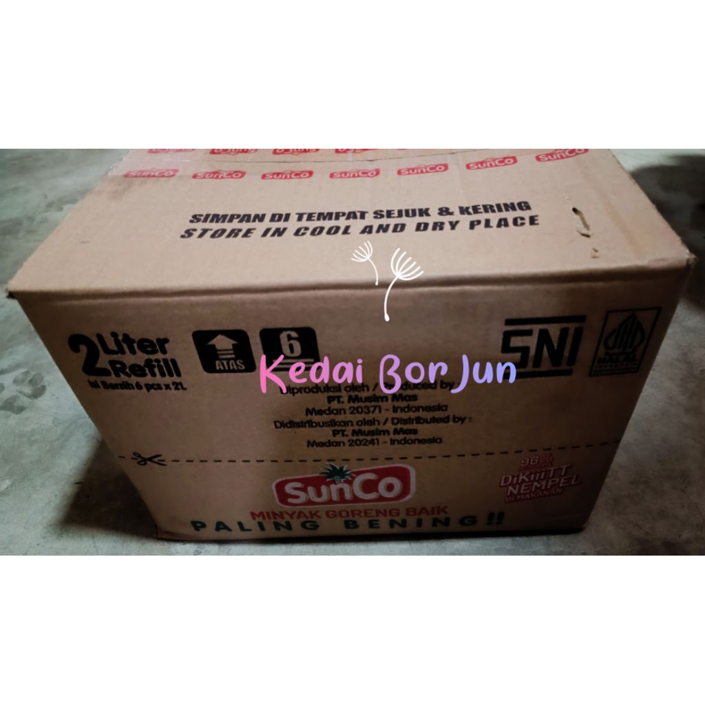 Minyak goreng SUNCO dikemas dalam pouch 2000 ML (2 L). Dijual per karton. Per karton berisi 6 pouch.