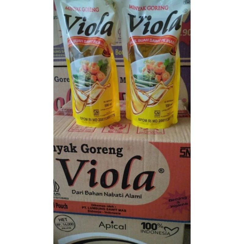 Minyak goreng Viola 800ml, bersertifikat HALAL, cocok untuk semua kebutuhan memasak Anda. Simpan di lemari untuk kesegaran.