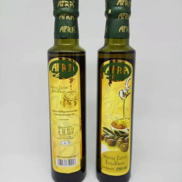 AFRA merupakan minyak zaitun extra virgin (minyak perawan) yang dihasilkan dari perasan buah zaitun pertama dan merupakan minyak zaitun terbaik karena tidak melalui banyak proses sehingga memiliki kualitas yang lebih tinggi. Aman diminum atau dioleskan, bermanfaat sebagai obat luar dan dalam, sebagai campuran makanan atau masakan, minyak urut, minyak rambut, penghalus kulit, untuk kecantikan wajah, pijat ataupun lulur.