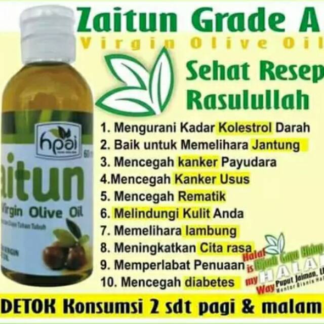 * Extra virgin olive oil adalah minyak zaitu berkualitas terbaik (grade A) yang diproduksi secara alami dengan aroma dan citarasanya istimewa dengan kadar keasaman kurang dari 0,8%