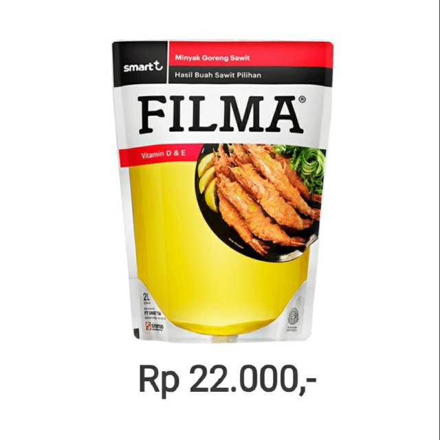 Filma minyak goreng pouch merupakan minyak goreng non kolesterol yang terbuat dari buah sawit segar pilihan, diproduksi dengan sistem pemurnian terintegrasi dan pengawasan mutu ekstra ketat, sehingga menghasilkan minyak goreng yang jernih bernutrisi. Filma minyak goreng mengandung asam lemak tak jenuh yang dapat membantu menjaga kadar kolesterol, Omega 6 & Omega 9 yang merupakan asam lemak esensial yang diperlukan oleh tubuh, Vitamin D yang baik untuk membantu pembentukan dan pemeliharaan tulang, serta Vitamin E sebagai anti oksidan alami. Warna kuning keemasannya berasal dari kandungan Beta Karoten alami (Pro Vitamin A).