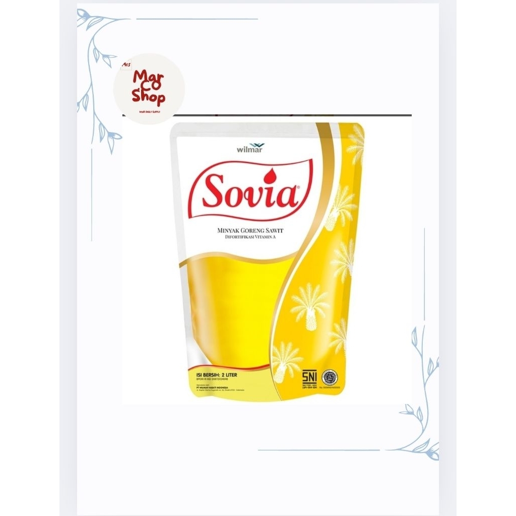 •Tersedia dalam kemasan pouch 2 Sovia Minyak Goreng Sawit 2 L adalah minyak goreng dalam kemasan yang difortifikasi dengan Vitamin A dan D yang masing-masing mempunyai peranan penting bagi tubuh. •Terbuat dari kelapa sawit pilihan dan diproses dengan teknologi mutakhir untuk hasilkan minyak goreng bermutu tinggi. •Kandungan Vitamin A nya membantu meningkatkan daya tahan tubuh, sedang Vitamin D membantu pembentukan struktur tulang dan gigi yang baik karena vitamin D •membantu penyerapan kalsium dalam tubuh. Juga mengandung Omega 6 dan Omega 9 yang baik untuk menyehatkan jantung dan mengurangi resiko penyakit jantung.