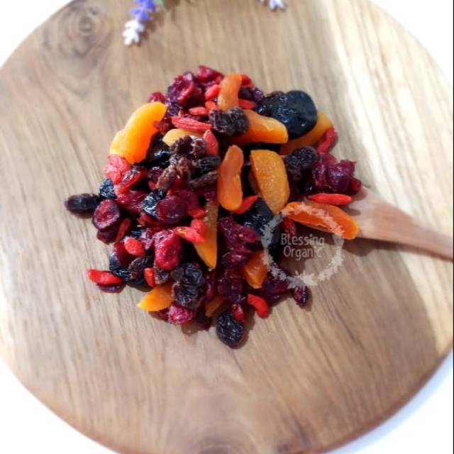 Mixed Fruits ini terdiri dari buah cranberries kering, kismis kering, gojiberry kering, apricot kering, dan plum.