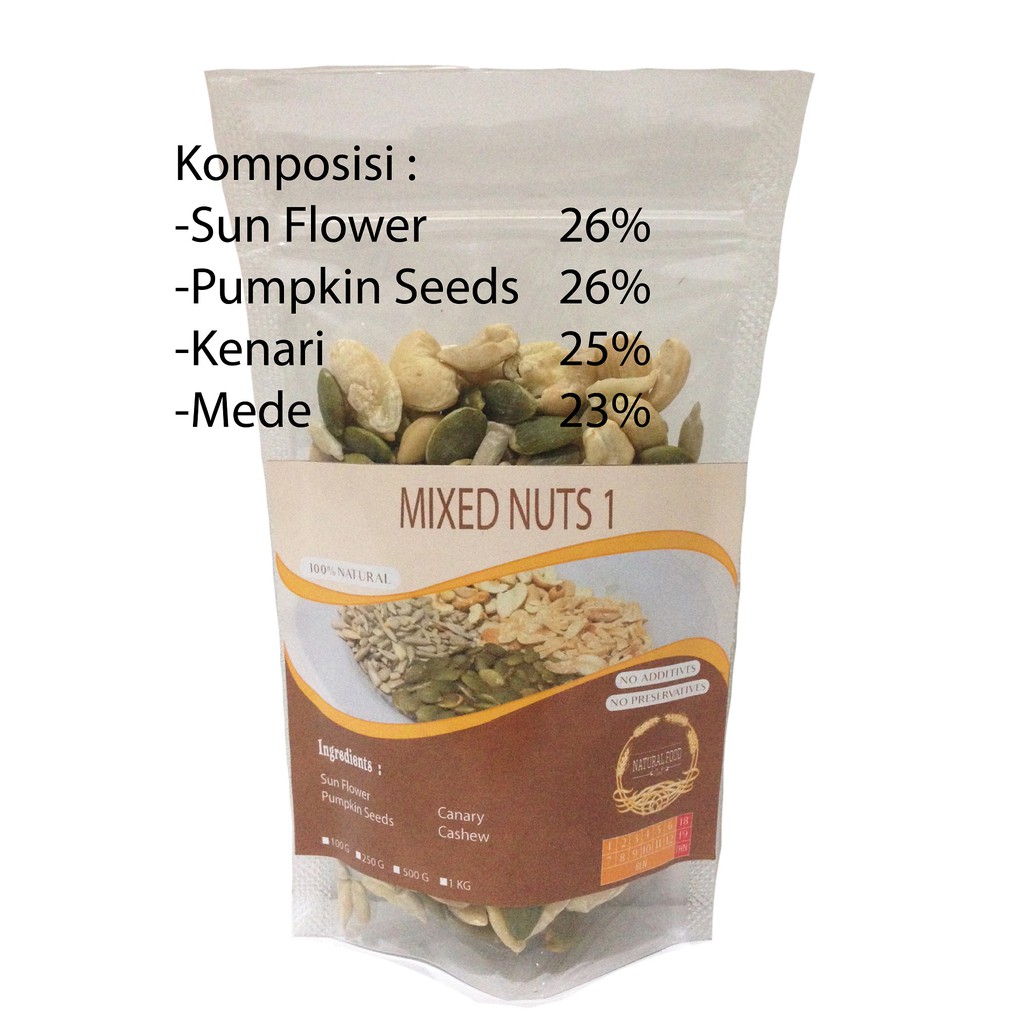-Sun Flower 25%, Pumpkin Seeds 25%, Kacang Kenari 25%, Kacang Mede 25%.