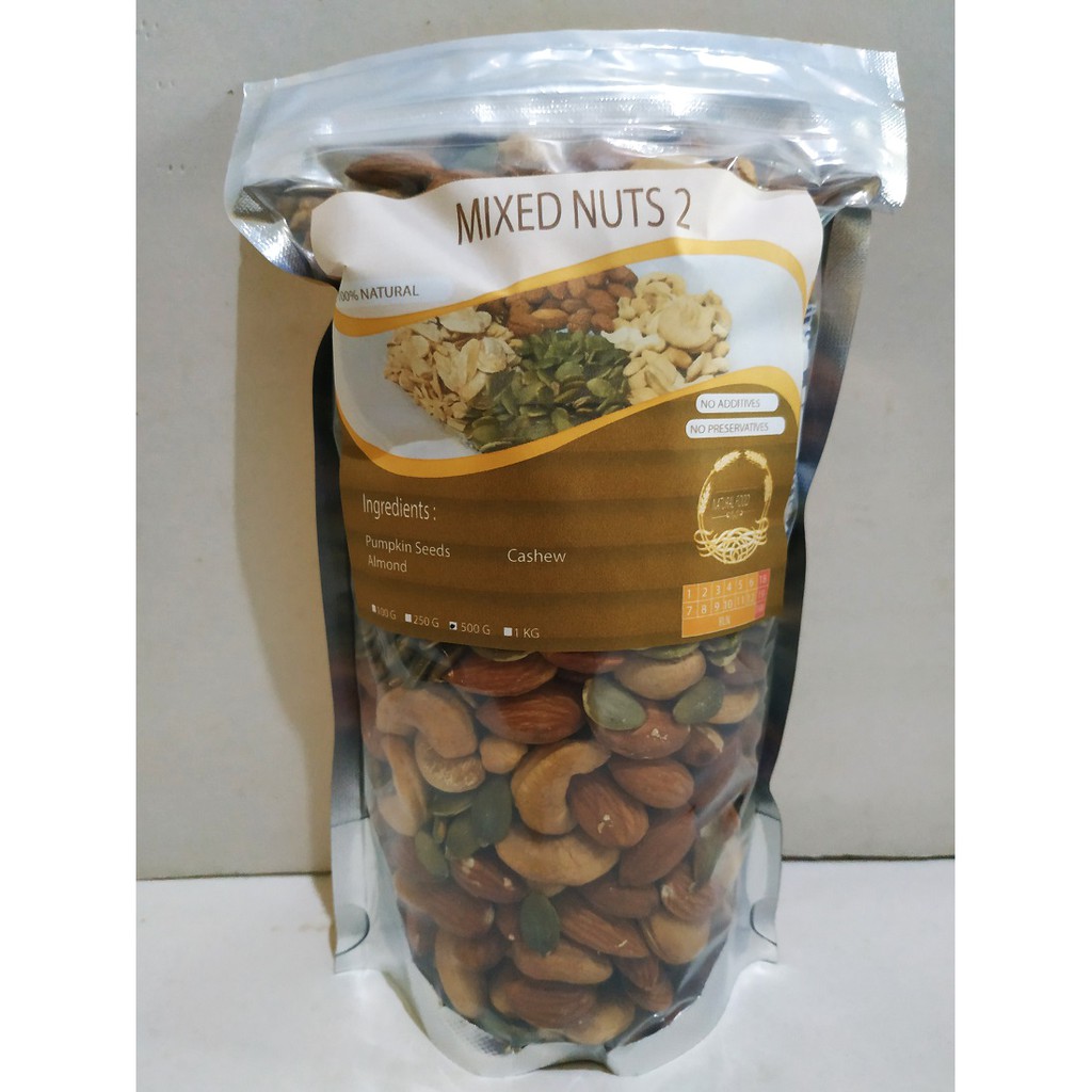 -Pumpkin Seeds 34%, Kacang Mede 33%, Almond 33%