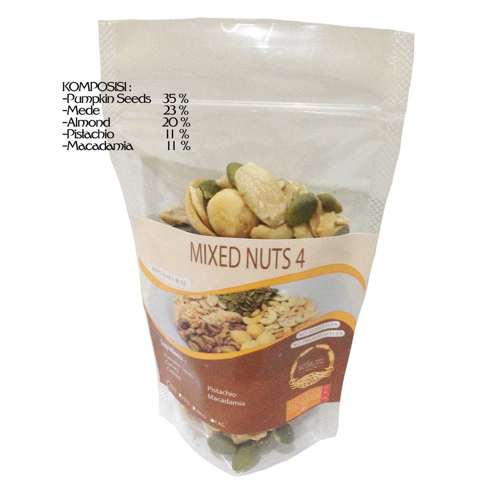 -Pumpkin Seeds 20% , Kacang Mede 20% , Almond 20%, Pistachio 20% , Macadamia Import 20%