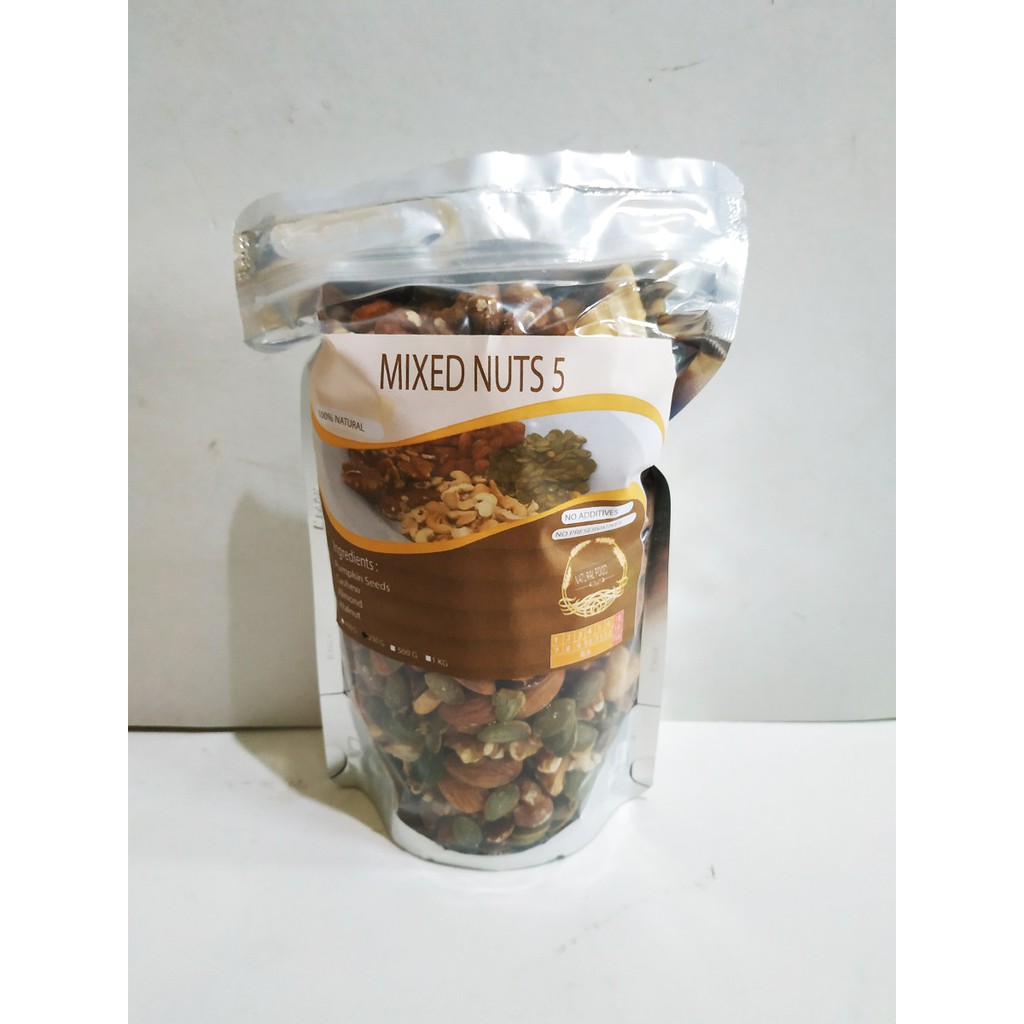 -Pumpkin Seeds 25%, Kacang Mede 25%, Almond Utuh 25%, Walnut 25%.