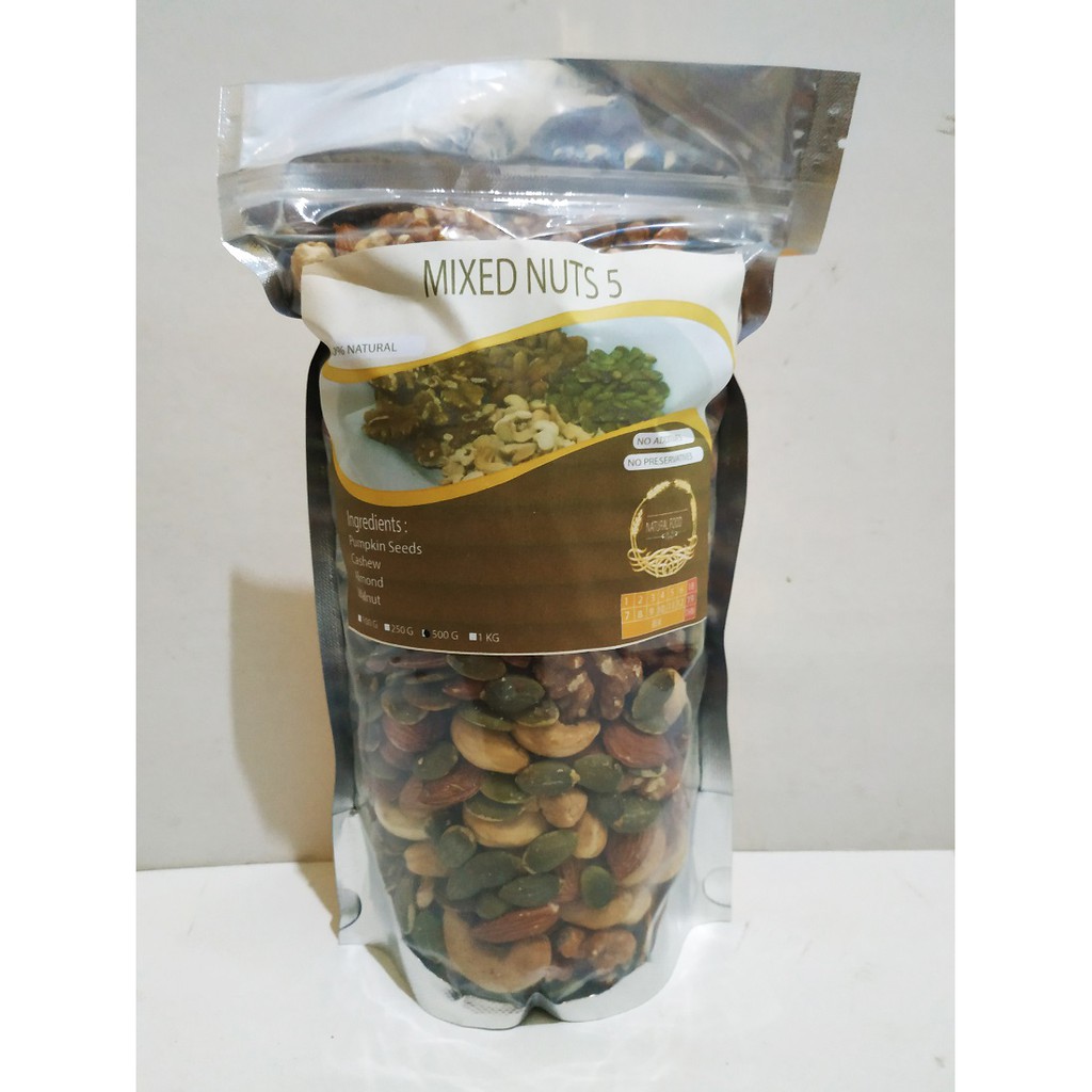 -Pumpkin Seeds 25%, Kacang Mede 25%, Almond Utuh 25%, Walnut 25%.