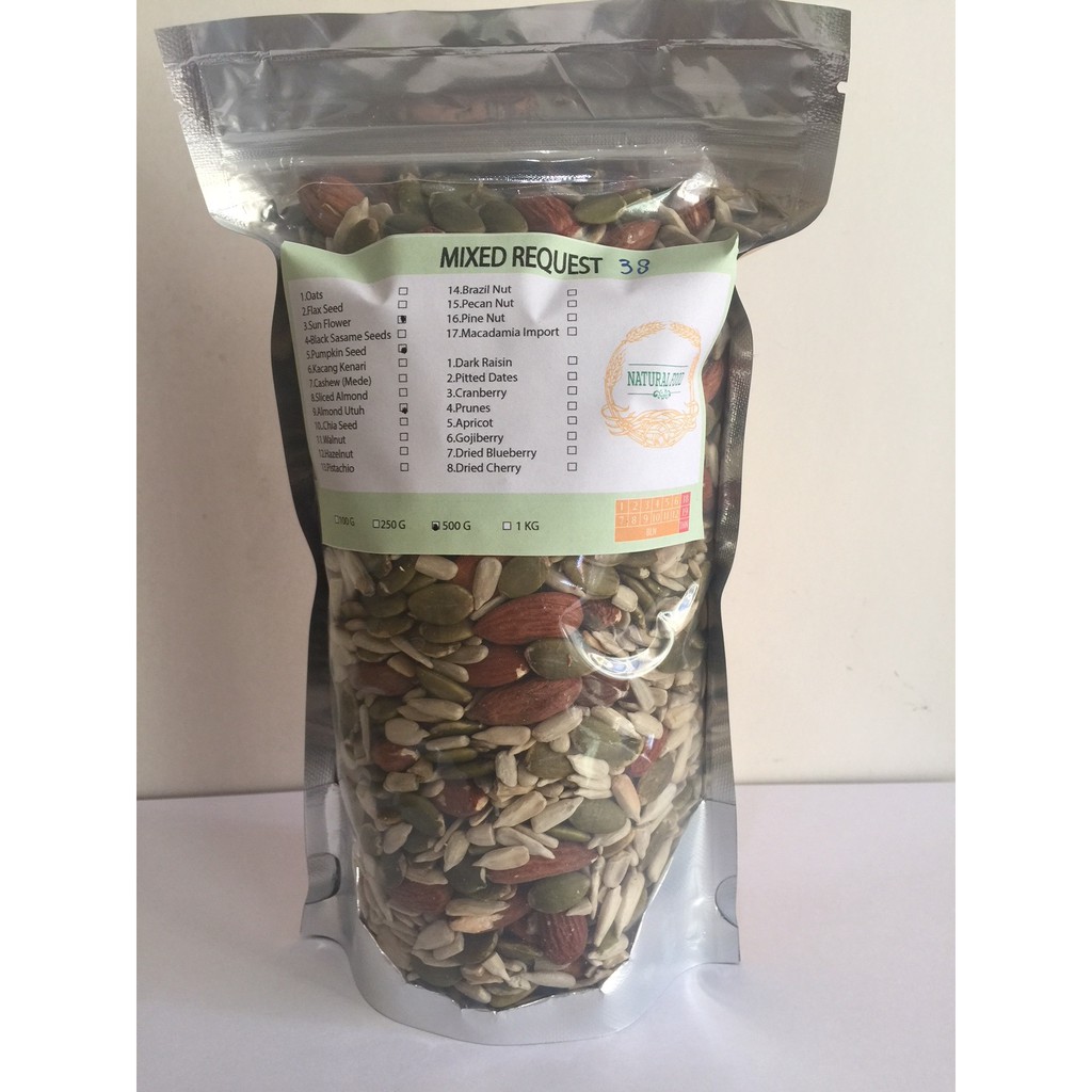 Almond 20%,cashew 10%,pumpkin seed 10%,pistachio 10%,macadamia 10%,kacang kenari 10%,cranberry 10%,dried blueberry 10%,apricot 10%