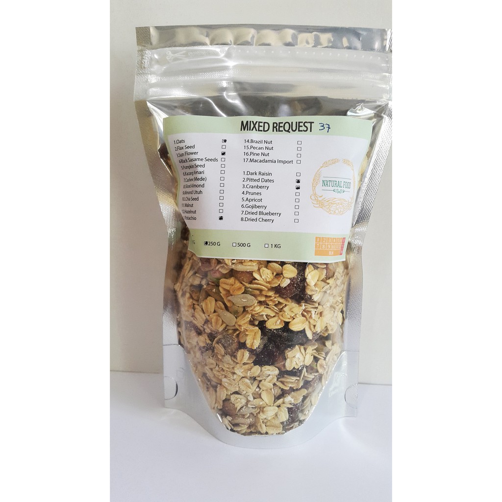 Slice almond 15% Oats 25% Pumpkin seed 25% Cashew 20% Chia seed 5% Dark raisin 10%