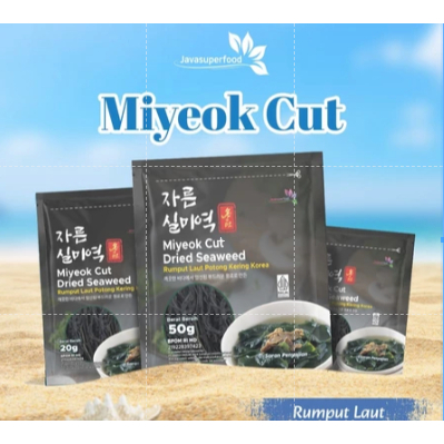 Miyeok Cut terbuat dari 100% rumput laut kering Korea yang sudah dipotong. Miyeok bisa disajikan untuk sup rumput laut, salad, ditumis, Ramen, udon dan Miso Soup